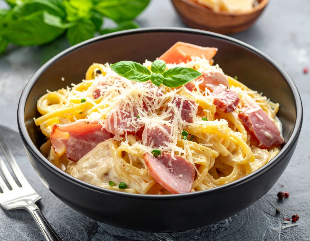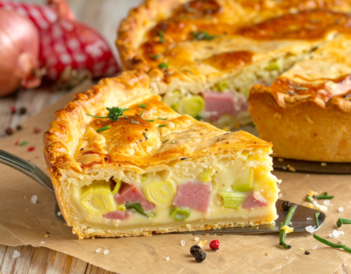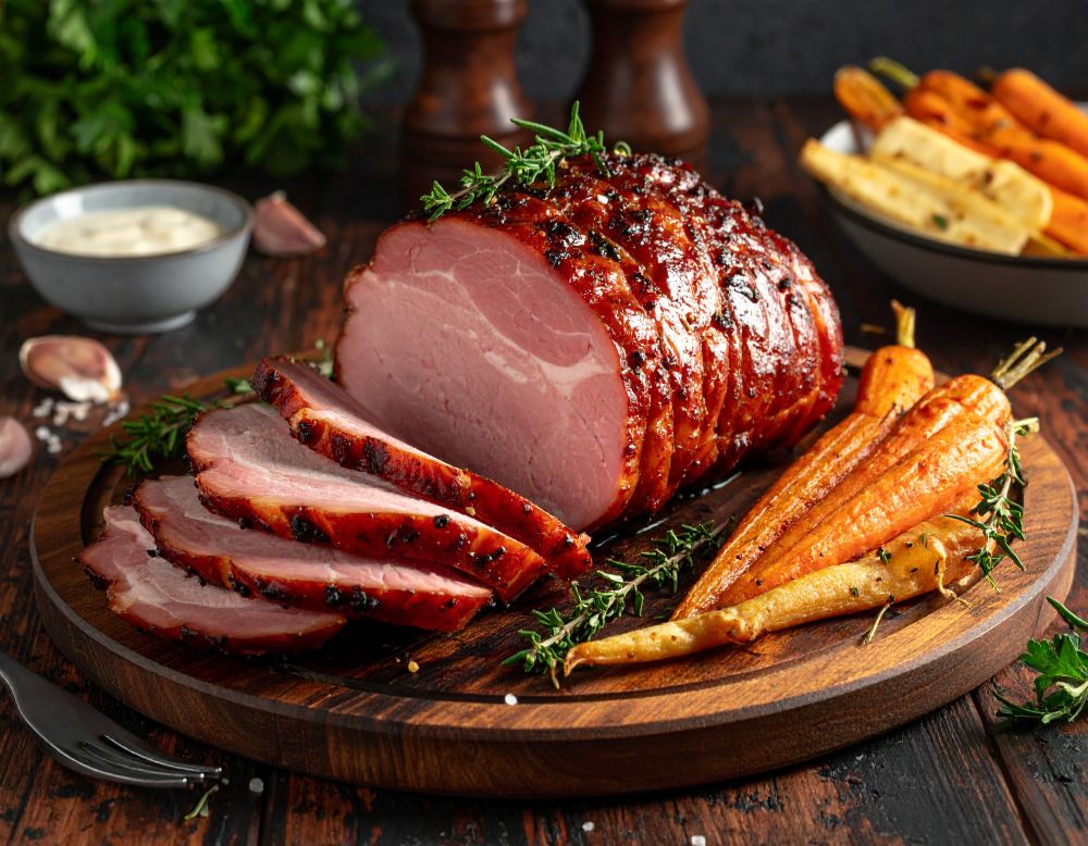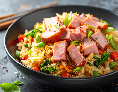 Mix the sweet potato cubes in olive oil and paprika, then roast at 200°C for about 20 minutes until tender. While they roast, fry the onion and pepper in a pan until soft, then stir in the gammon. Add the roasted sweet potatoes, season with salt and pepper, and mix everything together.